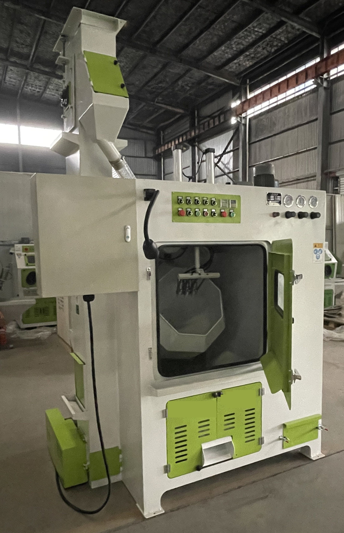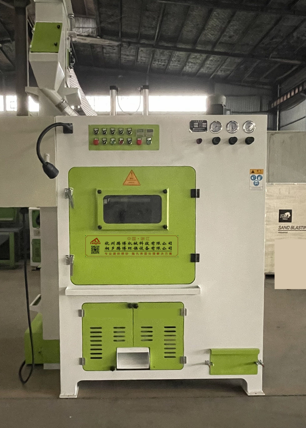 本機(jī)配置旋風(fēng)分離系統(tǒng)和除塵系統(tǒng),分離系統(tǒng)能將還可繼續(xù)使用的磨料和無用的粉塵分離,大大降低了磨料的消耗,提高了加工效率,降低了生產(chǎn)成本;除塵系統(tǒng)可把排放的無用微小粉塵進(jìn)行處理,且能自動(dòng)振動(dòng)清理粉塵(灰),除塵效果好,沒有環(huán)境 污染,粉塵排放濃度達(dá)到國家環(huán)保要求.