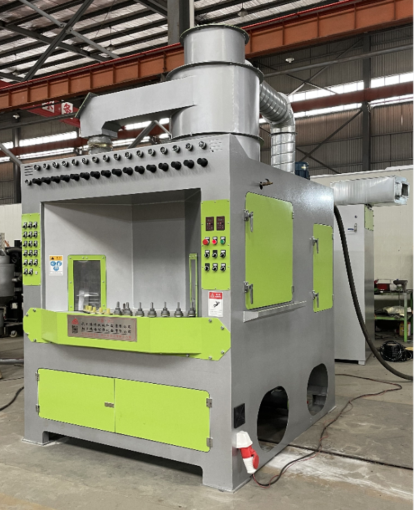 該自動噴砂機(可按客戶要求定制),主要用于處理回轉(zhuǎn)體工件的自動噴砂機,設(shè)1個大轉(zhuǎn)盤,大轉(zhuǎn)盤上設(shè)置8個小轉(zhuǎn)盤,針對小直徑工件可在小轉(zhuǎn)盤上設(shè)置復合多工位小轉(zhuǎn)盤,本機共分4個區(qū),分別為上下件區(qū)、第一隔離區(qū)、噴砂區(qū)、第二隔離區(qū)(吹凈區(qū)),每個區(qū)設(shè)兩個小轉(zhuǎn)盤,大轉(zhuǎn)盤轉(zhuǎn)動90°區(qū)域一停,工件由上下件區(qū)裝夾在小轉(zhuǎn)盤上,大轉(zhuǎn)盤轉(zhuǎn)動帶動小轉(zhuǎn)盤和工件進入噴砂區(qū),小轉(zhuǎn)盤在噴砂區(qū)自動旋轉(zhuǎn),噴槍往復擺動或移動對工件進噴砂加工,保證了工件噴砂均勻;配置我公司多年經(jīng)驗專業(yè)設(shè)計的上旋風分離器,分離效果好,精度高,無級可調(diào);配置獨立的氣動振打清灰布袋除塵器,也可根據(jù)用戶要求配置下沉流脈沖反吹清灰濾筒除塵器,除塵效果好,達到國家環(huán)保排放標準;本機采用成熟可靠的先進技術(shù)。